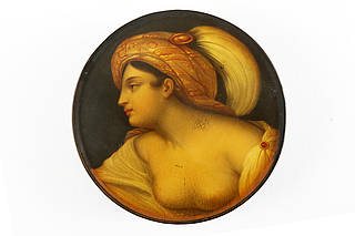 Runde Dose mit Profilbildnis einer jungen Türkin mit entblößter Brust, Schultertuch mit Agraffe und mächtigem, gemustertem Turban mit Federbusch. Neutraler Hintergrund.